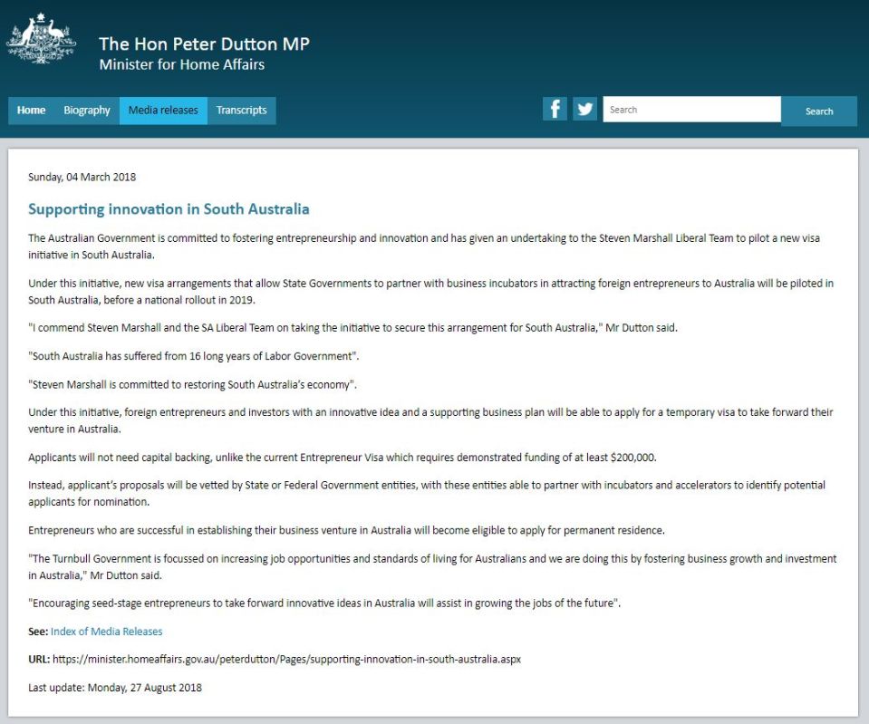 内政部长杜敦(Peter Dutton)向南澳自由党承诺,将从南澳开始试行这一签证。他表示,有关签证将推动澳洲的企业发展并促进投资,提升就业机会,振兴南澳经济。