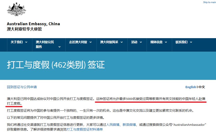 A:每年提供给中国首次申请打工与度假签证的申请人5000个名额。如果当年名额已满,澳大利亚将于第二年再接受新申请。