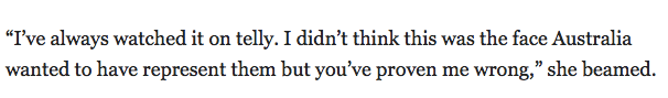 采访中,Francesca表示,“我不认为我的(亚裔)面孔是澳洲人想要用来代表他们的,但是大家向我证明我想错了”