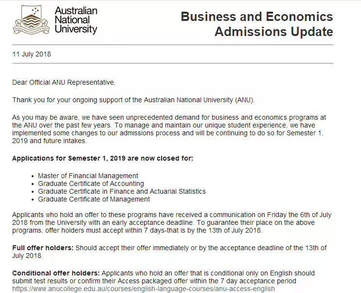 目前ANU商学院已接到超量申请,故学院已决定提前关闭2019年Semester 1 以下专业的申请。
