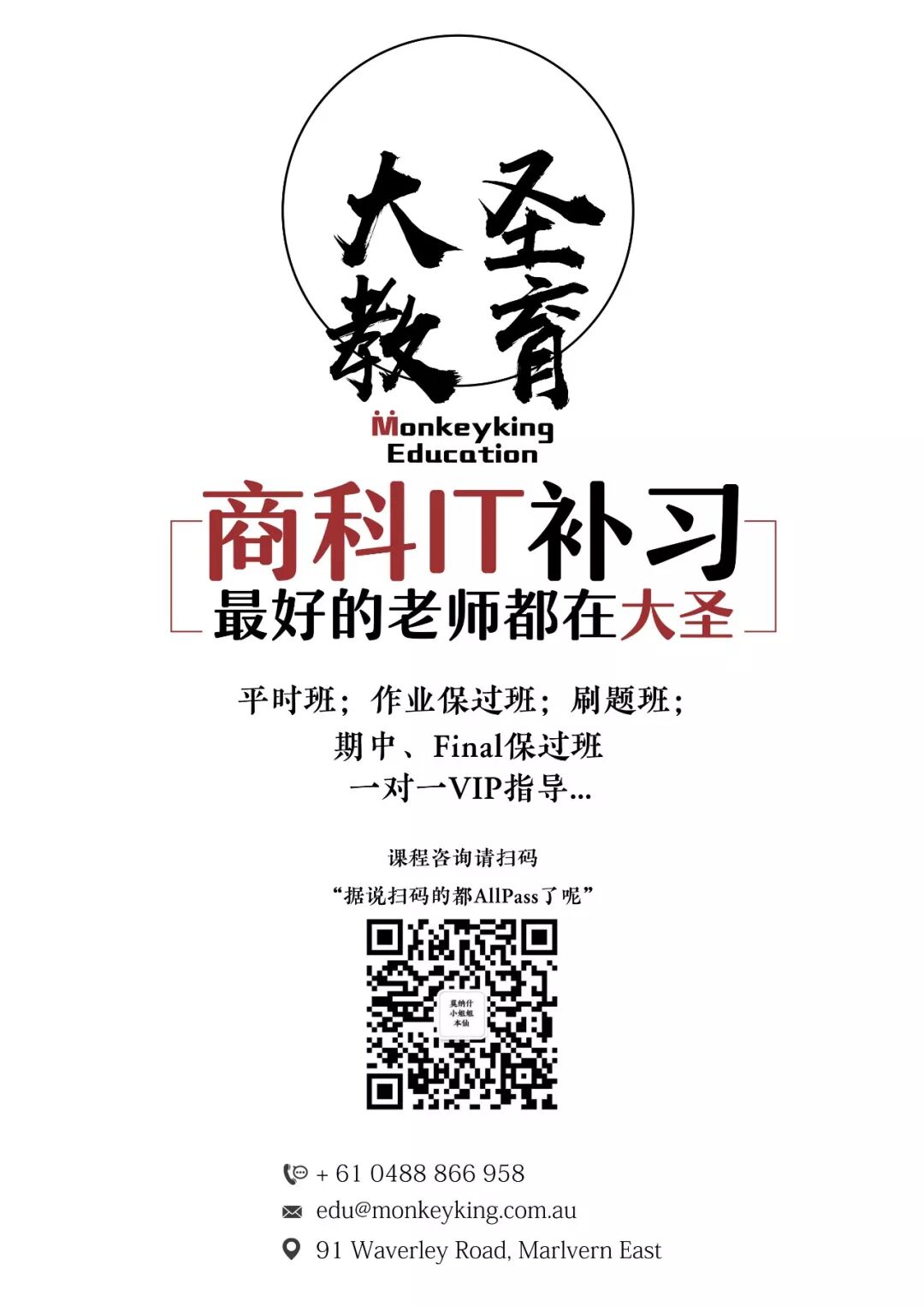 【大圣教育 — Monkeyking Education】是澳洲移民留学行业领头企业 Monkeyking移民留学旗下所属的专业补习培训机构。授课内容包括Monash、墨尔本大学的商科补习、IT补习;CPA培训、CFA培训、PTE培训等多种课程。