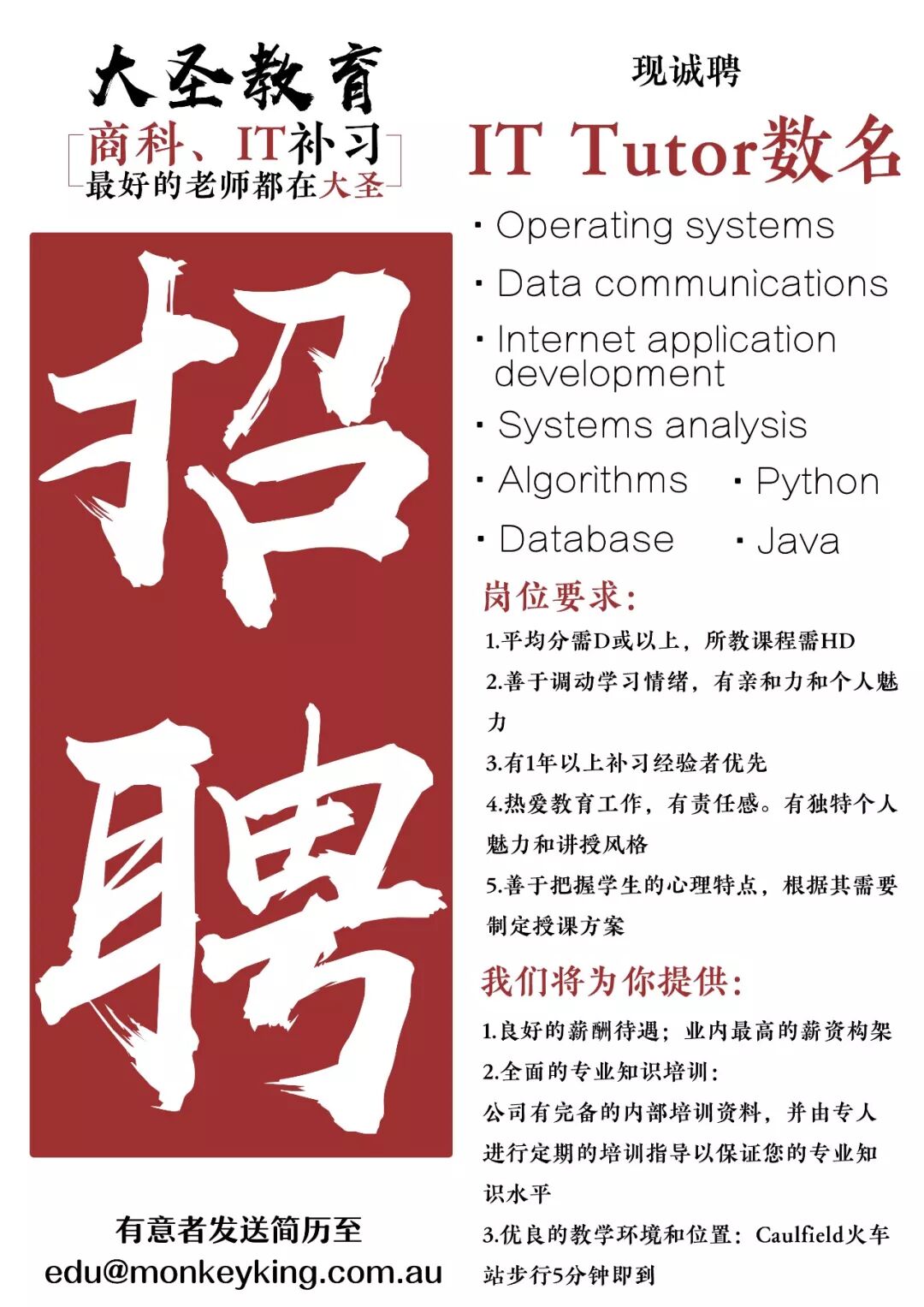 最高时薪$300+!【大圣教育】诚聘莫纳什IT补习教师