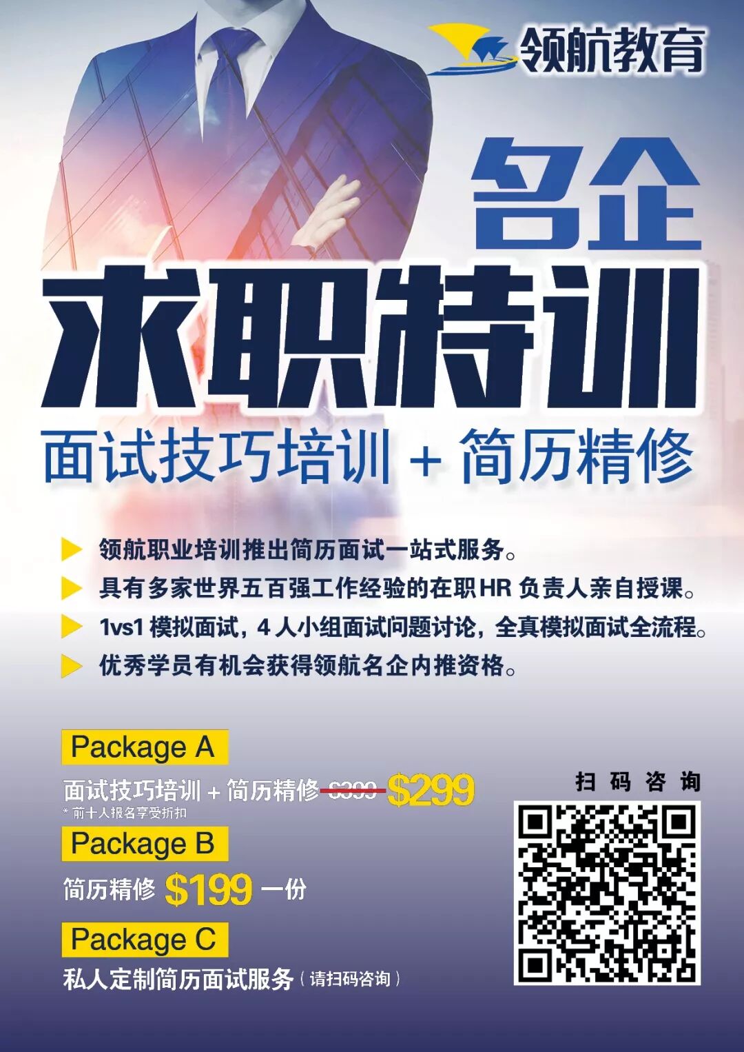 Package A) 面试技巧培训+简历精修 $399 $299 (前十人报名享受折扣)