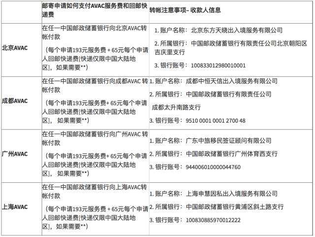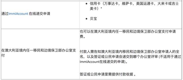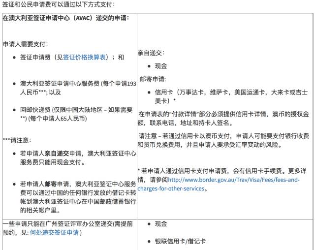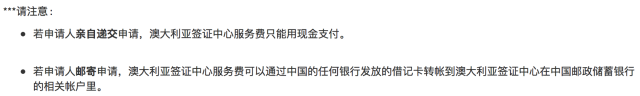 * 签证申请费还可于澳大利亚境内任一签证处支付。付款人须告知签证处人员申请人的全名及递交申请的具体地点。付款收据须附于申请中。如果申请人需在上海、北京或广州递交签证申请,还须向AVAC支付相应的服务费和回邮快递费。