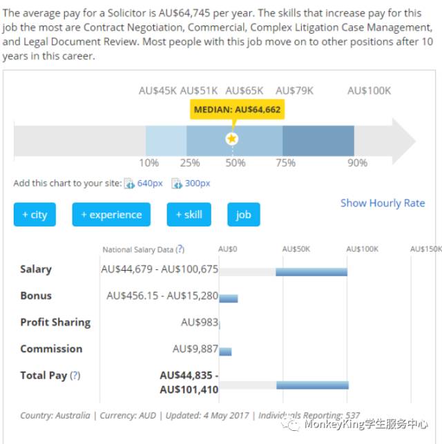 根据PayScale的数据,Solicitor 的年薪在AU$44,679 – AU$100,675, 中等年薪在AU$64,662。也算是高薪职业。