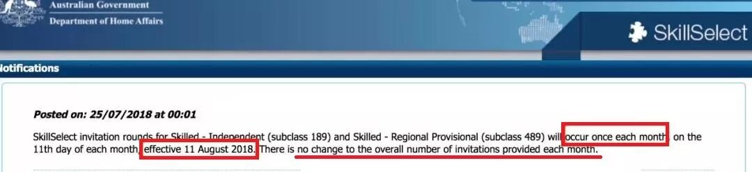 简单点说就是,Skillselect针对189独立技术移民和489亲属担保移民邀请将会从原来一月两次发放改为一月一次发放!从2018年8月11号开始生效。但每个月发邀请的总数不变。