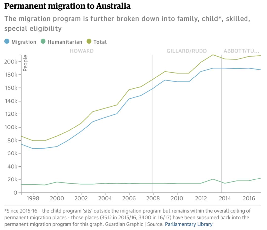 周五的时候,澳大利亚新闻公布了内政部的数据,在2017-18财年一共有163,000位申请人获得永久居民,其总体数量低于去年和前年的配额,190,000和183,608。