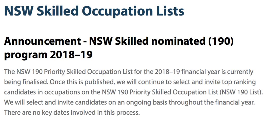 NSW-190州担保职业列表即将更新。本周NSW州政府官网悄悄更新了一条消息,NSW-190的2018-19财年职业列表目前已经准备完毕。这也意味着接下来190的邀请即将开放