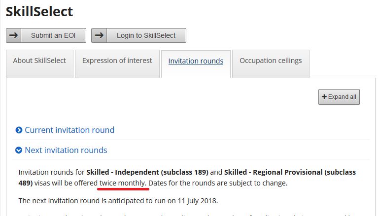 SkillSelect invitation rounds for Skilled – Independent (subclass 189) and Skilled – Regional Provisional (subclass 489) will occur once each month, on the 11th day of each month, effective 11 August 2018There is no change to the overall number of invitations provided each month.