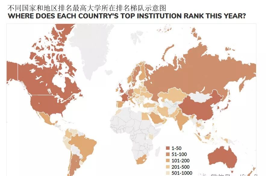 (不同国家和地区排名最高大学所在梯队示意图,来源:QS)
