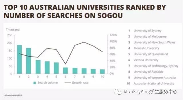 数据显示,自2014年以来,利润丰厚的中国留学生市场中,对于澳洲大学的搜索量每年增幅达到33%。不过澳洲在搜索量方面仍逊色于美国和英国。