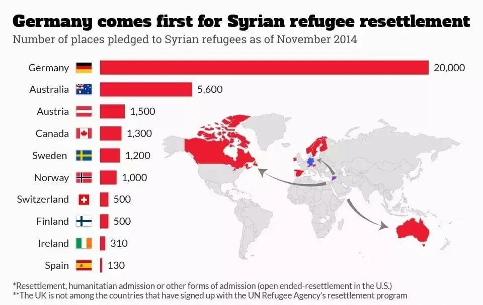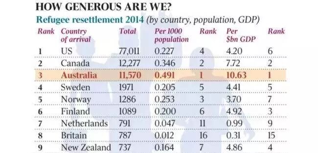 以2014年的数据来说,澳大利亚共接受了11570名难民,就澳大利亚2000多万的人口的和GDP总量来说,都在接受难民的程度上排第一。