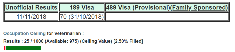 截止到2018年9月11日最新一轮的EOI邀请,兽医(Veterinarians)配额仅用掉25个,还剩975个之多!因此,作为一个冷门专业,仅需70分便可获得邀请,而且完全不用担心配额不够、分数上涨的问题。