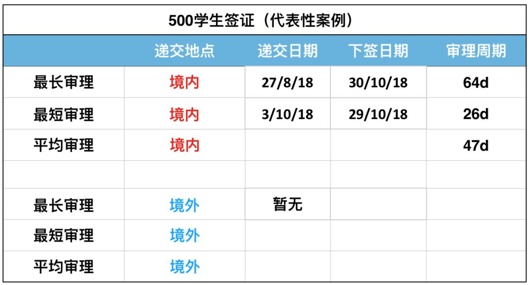 对于500学生签证,485毕业生工作签证及600旅游签证,表格中为大家选出具有代表性的常规案例来统计当前审理进度。如若有部分申请人尚未在表中列出的最长审理时间拿到签证,也无需惊慌,在众多申请案例中也属正常。