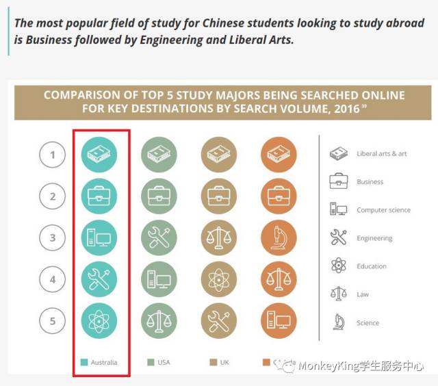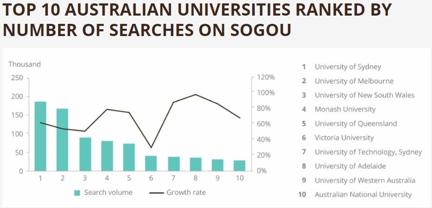 数据显示,自2014年以来,利润丰厚的中国留学生市场中,对于澳洲大学的搜索量每年增幅达到33%。不过澳洲在搜索量方面仍逊色于美国和英国。