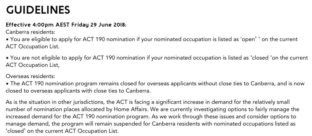 ACT州担保新财年新政策在一定时间不会出现邀请规定的更新。然而,州政府默默的对于申请的提名列表做了修正,阻止了大部分职业的申请。此次修改生效于2018年6月29日。