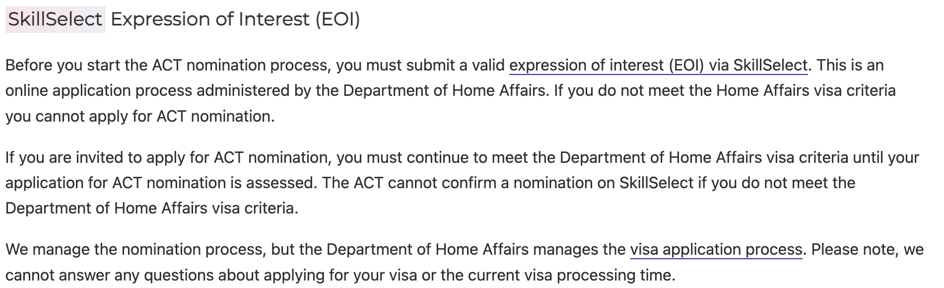 在开始 ACT 提名流程之前,您必须通过 SkillSelect提交有效的意向书 (EOI)。这是由内政部管理的在线申请流程。如果您不符合内政部签证标准,则无法申请 ACT 提名。