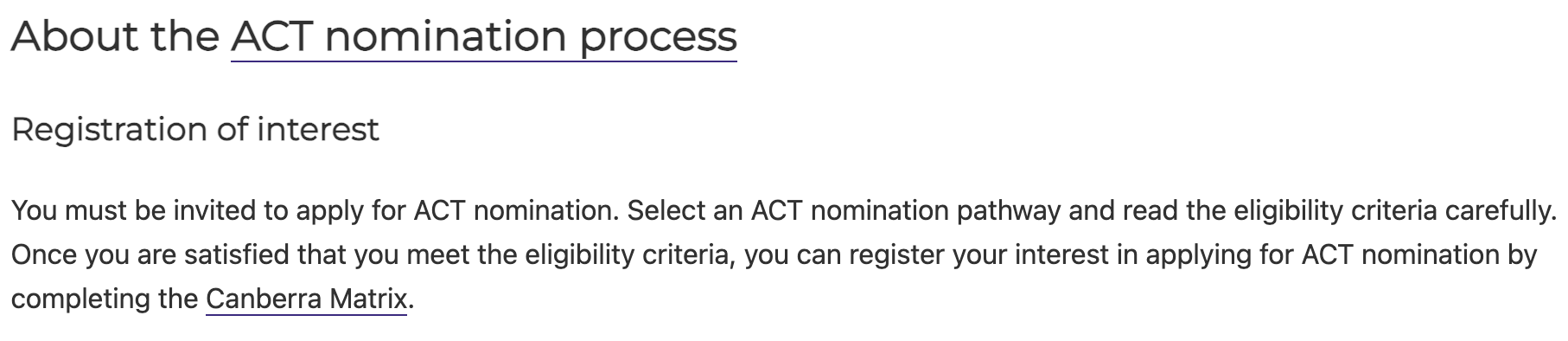 您必须被邀请后才能申请 ACT 提名。请选择 ACT 提名途径并仔细阅读资格标准。一旦您确定自己符合资质,您将可以通过填写ACT州担打分系统(Canberra Matrix)来登记您申请 ACT 提名的兴趣。