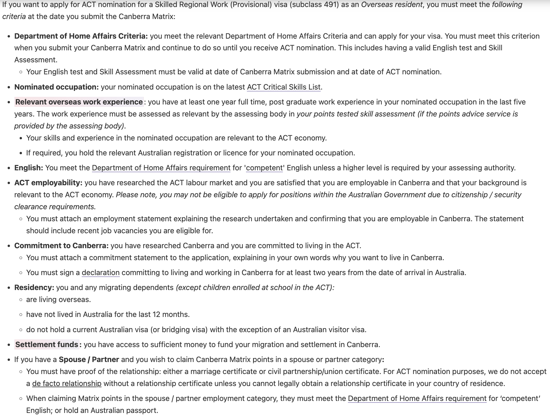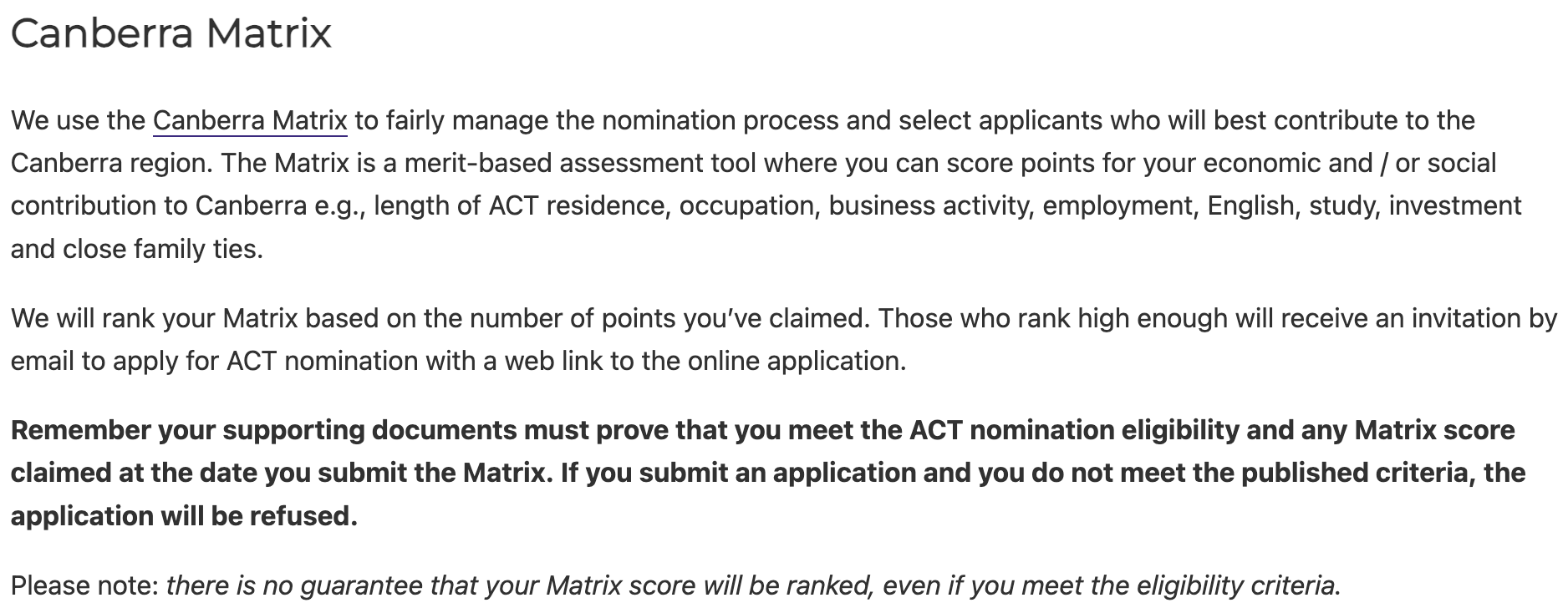Canberra Matrix是有权重的打分表,以确保将会或者已经对ACT做出积极经济贡献或者表现出对 ACT 有真正承诺的申请人更有可能获邀申请ACT提名。