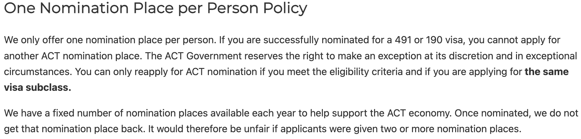 ACT政府只为每位申请人提供一个提名名额。如果您已成功获得 491 或 190 签证提名,您将无法申请另一个 ACT 提名名额。ACT政府保留在特殊情况下自行决定破例的权利。只有当您符合资格并且您申请的是相同的签证时,您才能重新申请 ACT 提名。