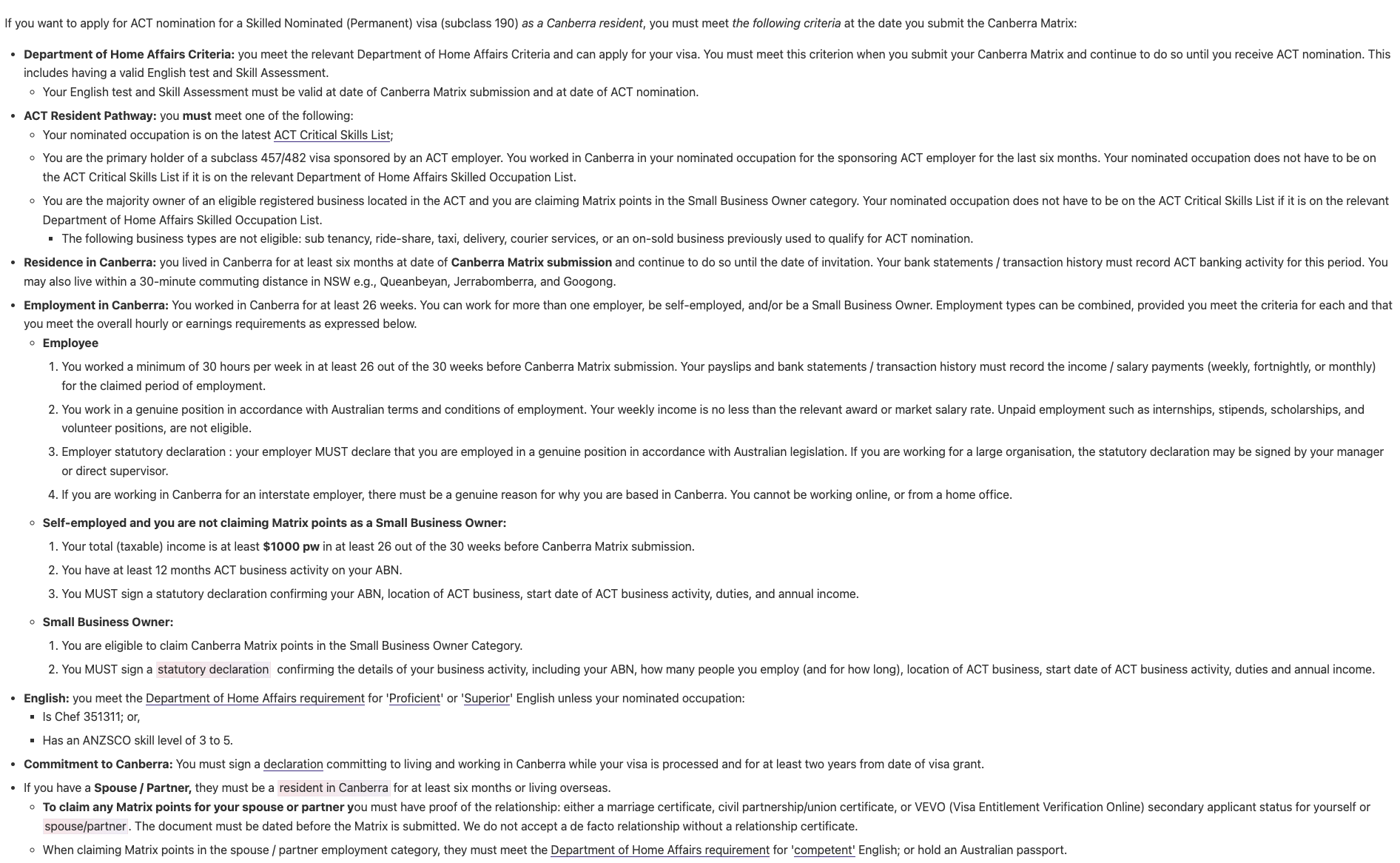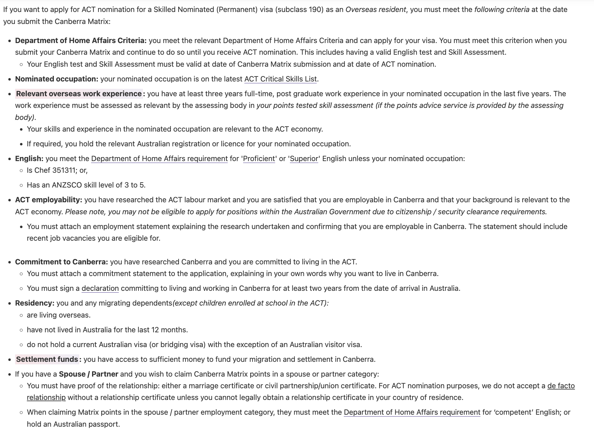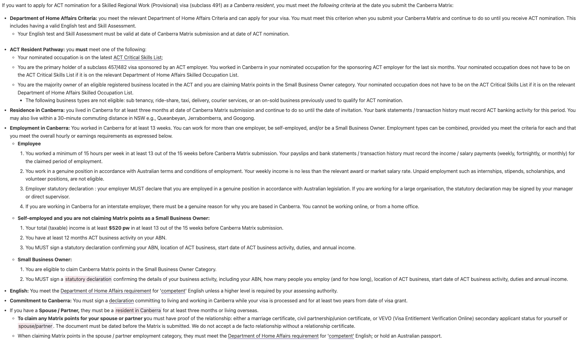 ACT政府使用ACT州担打分系统(Canberra Matrix)来公平地管理提名过程,并选择对堪培拉做出最大贡献的申请人,可以根据您对堪培拉的经济和/或社会贡献进行评分,例如,在ACT的居住时间、职业、商业活动、就业、英语、学习、投资和密切的家庭关系。