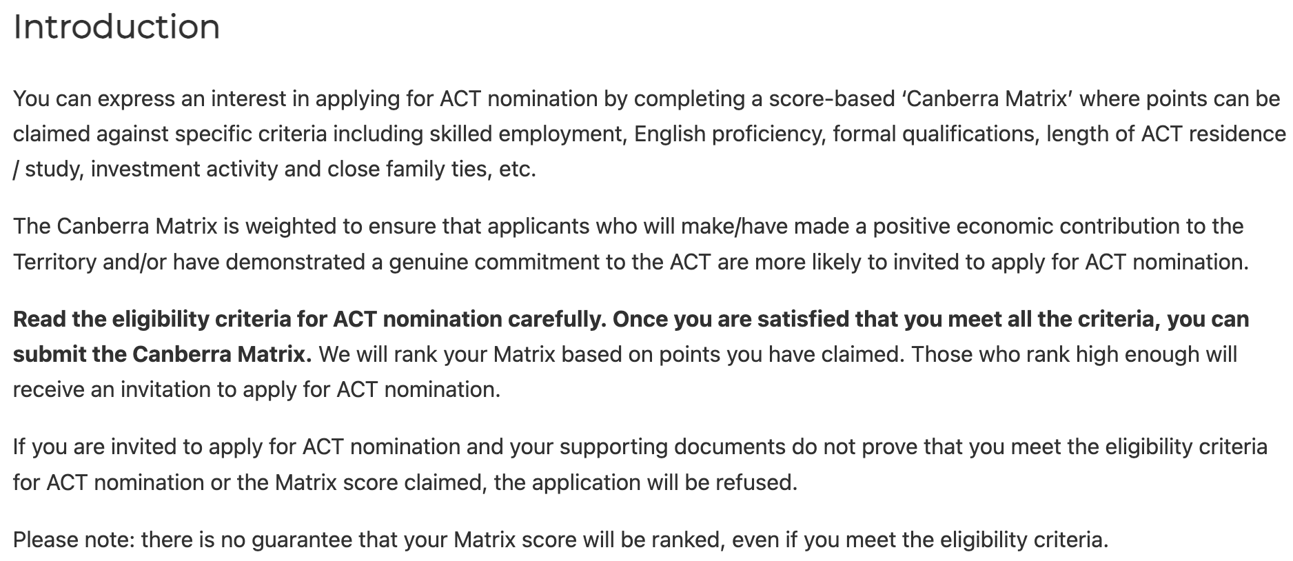 ACT政府将根据Canberra Matrix的分数进行排名。排名足够高的人将获得申请 ACT 提名的邀请。