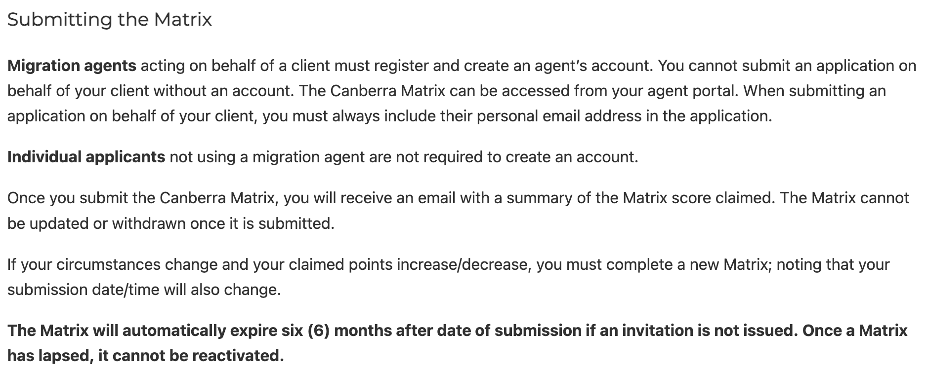 提交Canberra Matrix后,您将收到一封电子邮件,其中包含所申请的Matrix分数摘要。Matrix一旦提交,就无法更新或撤销。